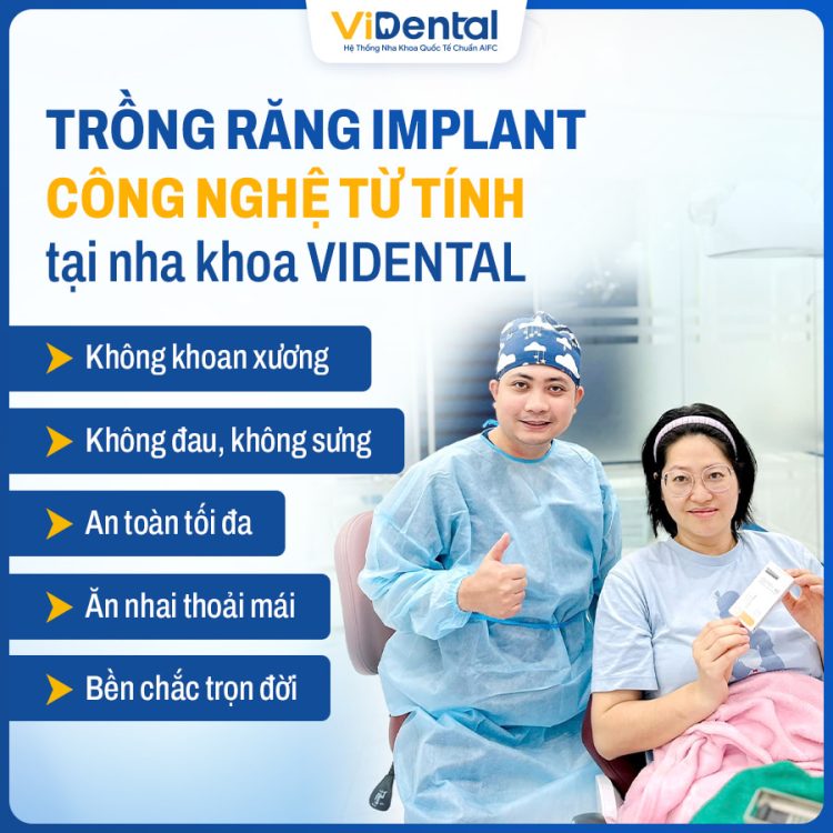 Với đội ngũ bác sĩ hơn 10 năm kinh nghiệm cùng trang thiết bị hiện đại như máy CT Cone Beam 3D, máy từ tính Osseotouch…, và quy trình vô trùng nghiêm ngặt, ViDental cam kết mang đến tỷ lệ cấy ghép thành công cao, đảm bảo ăn nhai chắc chắn và thẩm mỹ tự nhiên.